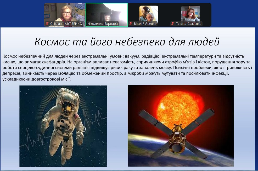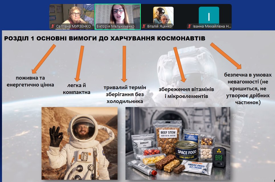 В секції «Астробіологія та космічна медицина», онлайн, учнівська молодь ділилася отриманими знаннями про позаземне життя, про здоров’я космонавтів, про їжу космонавтів і проблеми їх раціонального харчування, про палеоконтакт, про аеропонічне вирощування рослин.