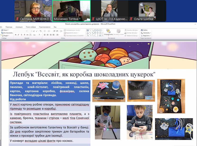 В секції Міні Всесвіт, онлайн, діти представляли власноруч створені проєкти: лепбук «Всесвіт, як коробка шоколадних цукерок», «Мій дім – наша Галактика в мініатюрі», «Місія «Дістатися Марсу» (комп’ютерна гра)», «Космос в моїй кімнаті». Доповідь англійською мовою «Моє перше астрономічне спостереження» уважно слухали всі присутні.