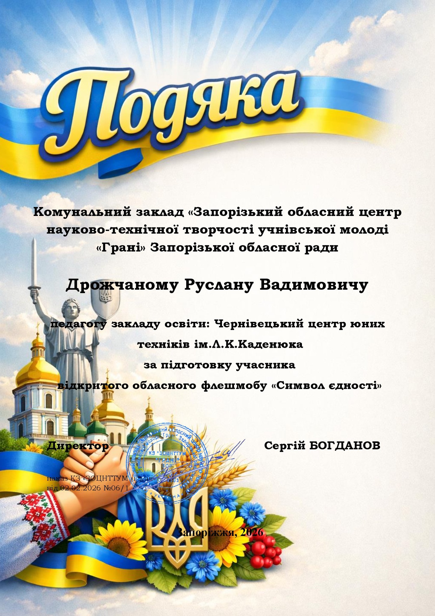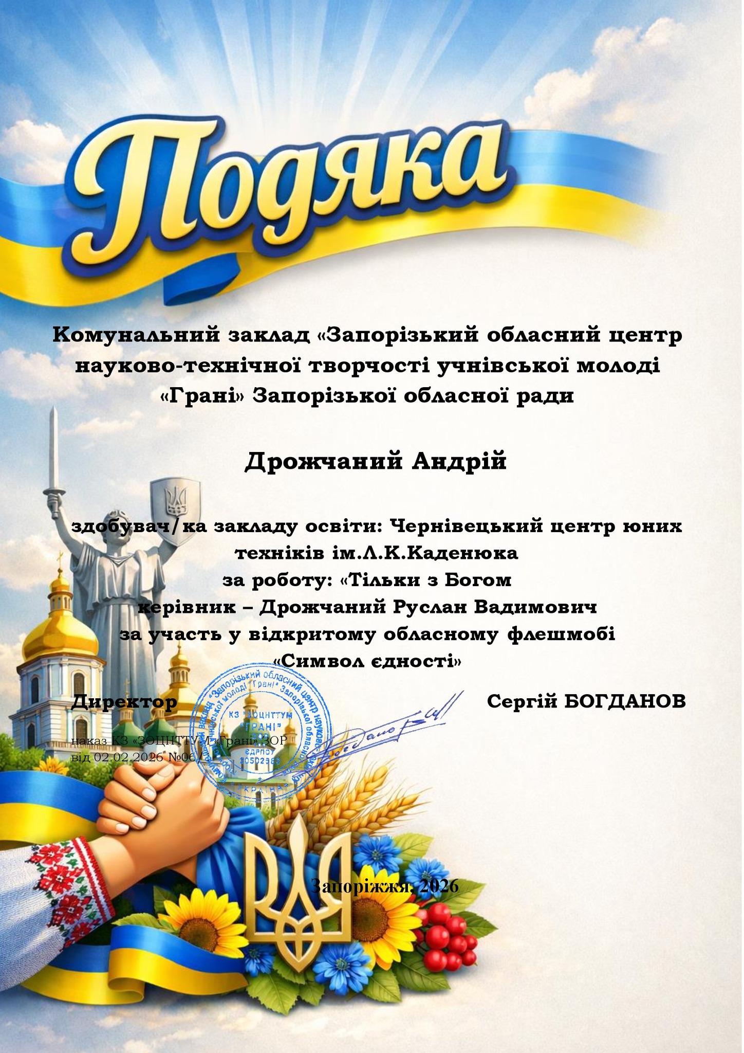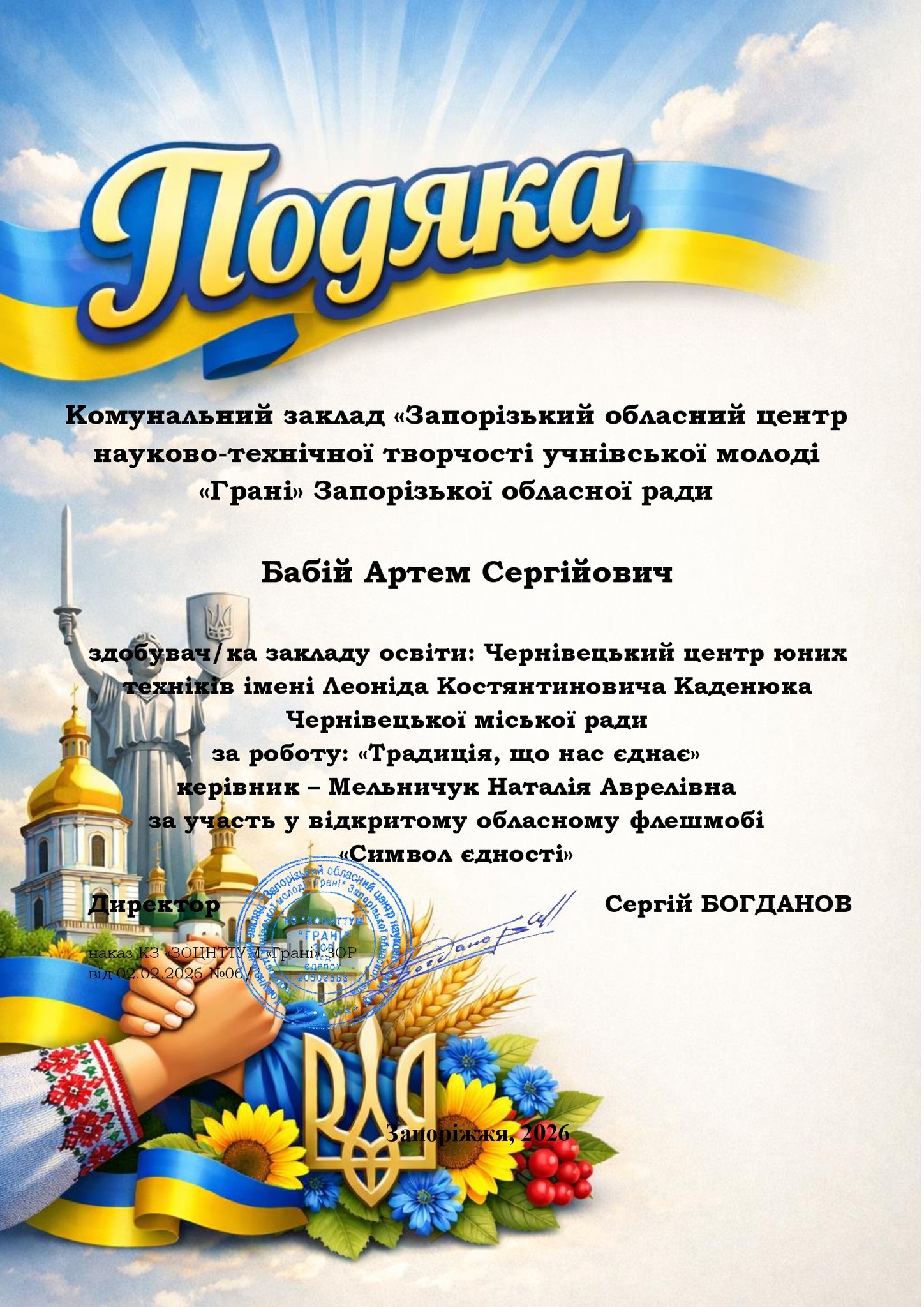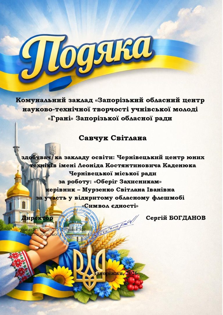 Щиро вітаємо ЧИСЛАШ Марію, АНДРУЩАК Аріну, КОНОНЕНКО Ольгу, КУЧЕРЯВУ Надію, КУШНІРЮК Еммануелу, ХОМЕНКА Назара, МАКАРОВА Антона, САВЧУК Світлану, ДРОЖЧАНОГО Андрія, ЧУПІКОВА Вадима, БАБІЯ Артема з отриманням сертифікатів у відкритому обласному флешмобі «Символ єдності», м. Запоріжжя.