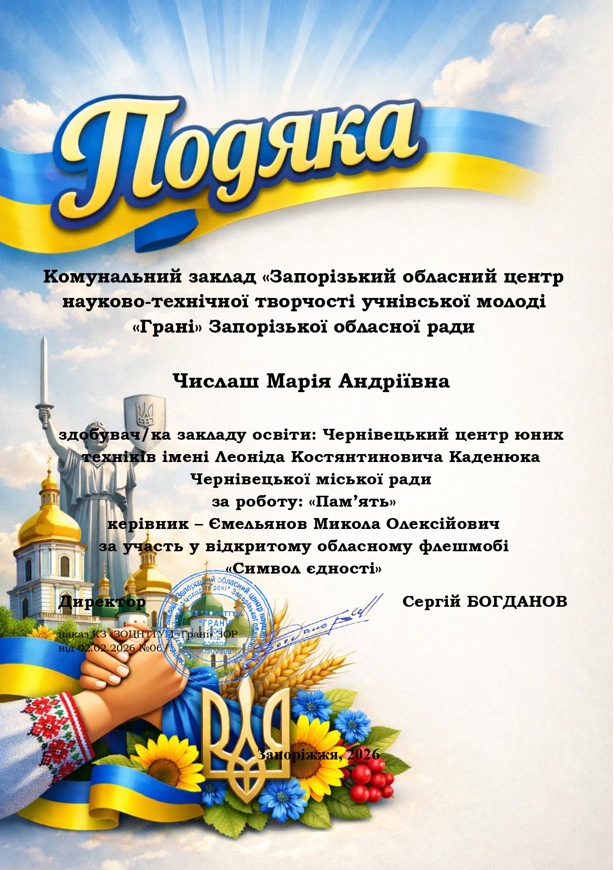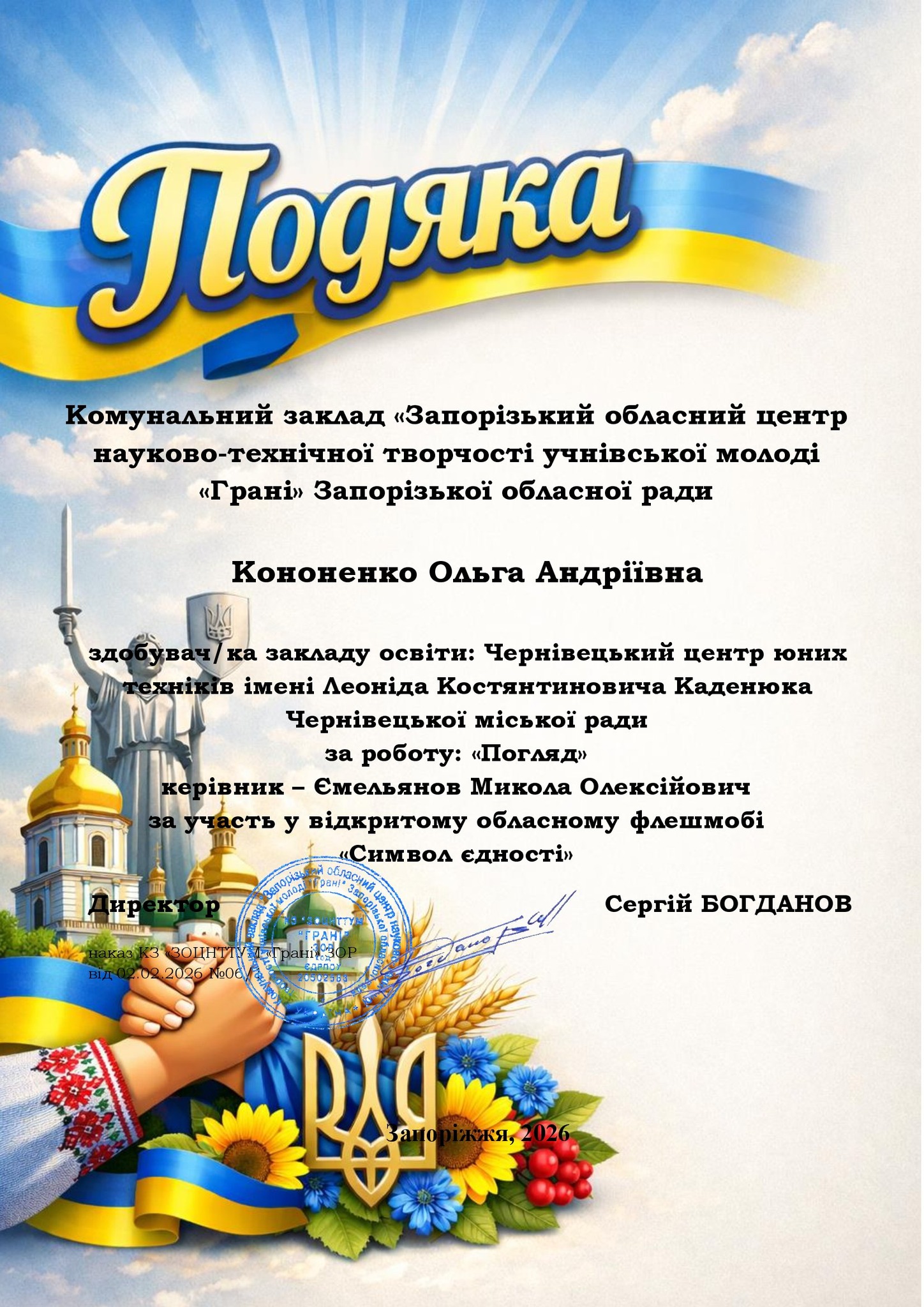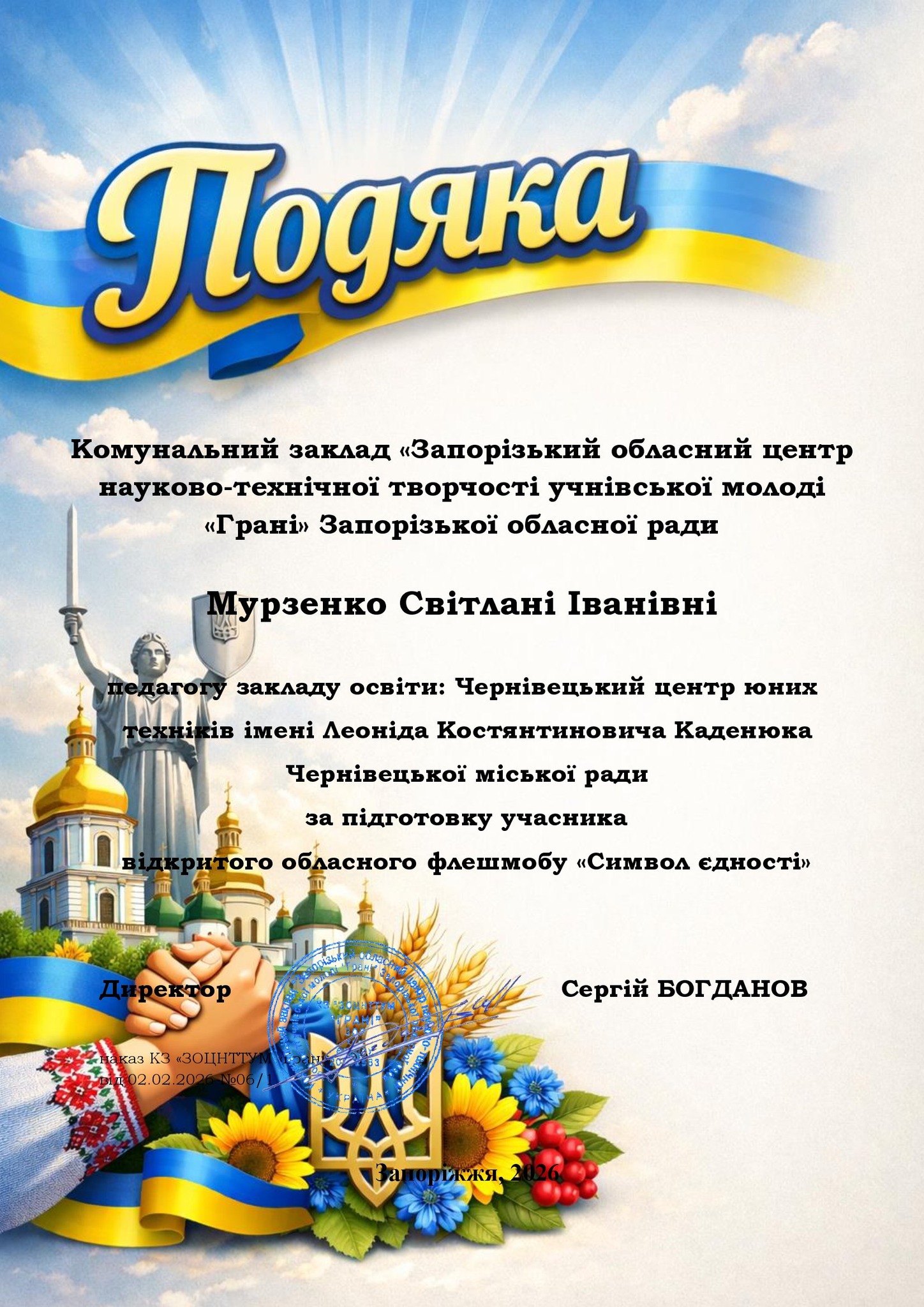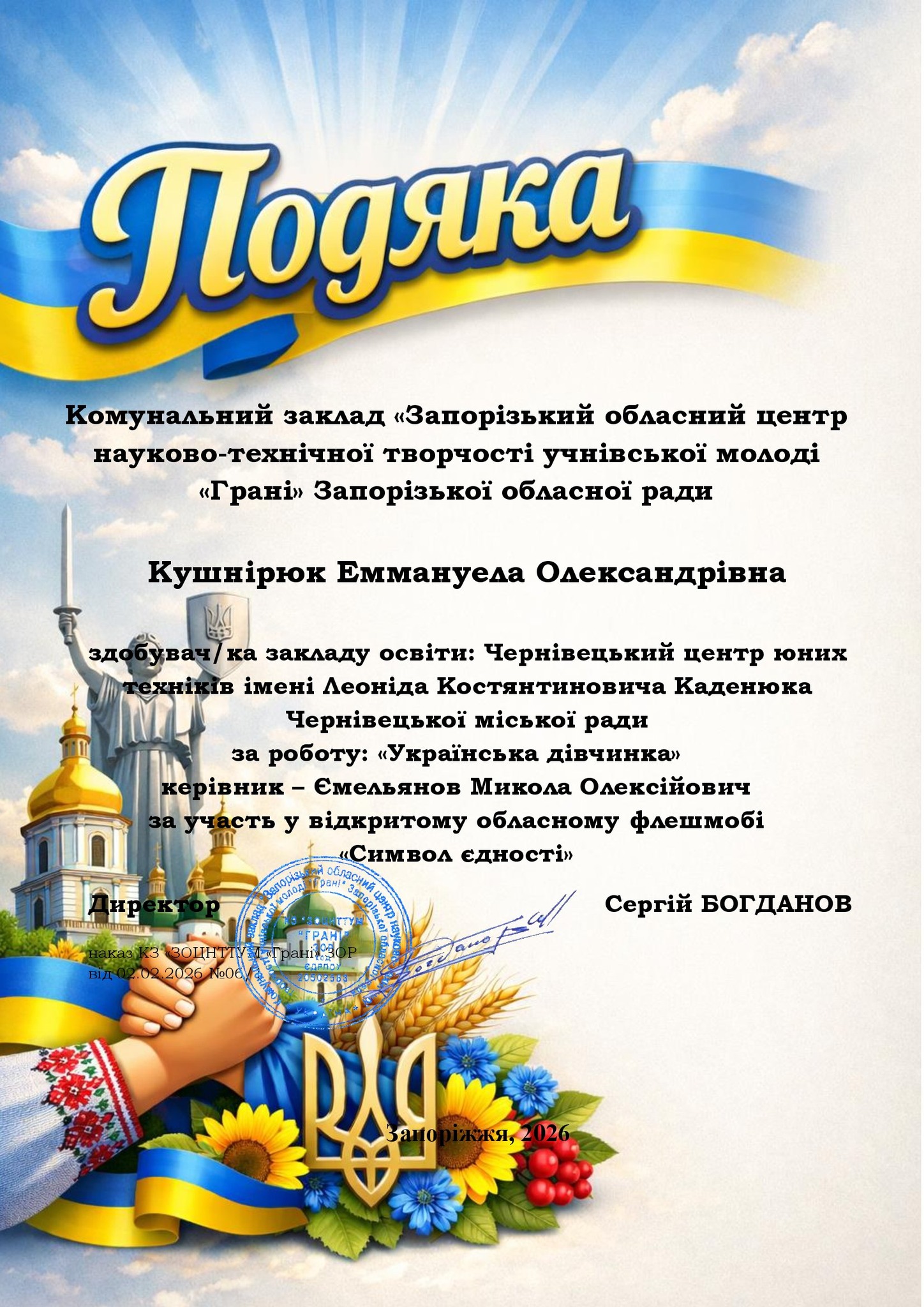 Щиро вітаємо ЧИСЛАШ Марію, АНДРУЩАК Аріну, КОНОНЕНКО Ольгу, КУЧЕРЯВУ Надію, КУШНІРЮК Еммануелу, ХОМЕНКА Назара, МАКАРОВА Антона, САВЧУК Світлану, ДРОЖЧАНОГО Андрія, ЧУПІКОВА Вадима, БАБІЯ Артема з отриманням сертифікатів у відкритому обласному флешмобі «Символ єдності», м. Запоріжжя.