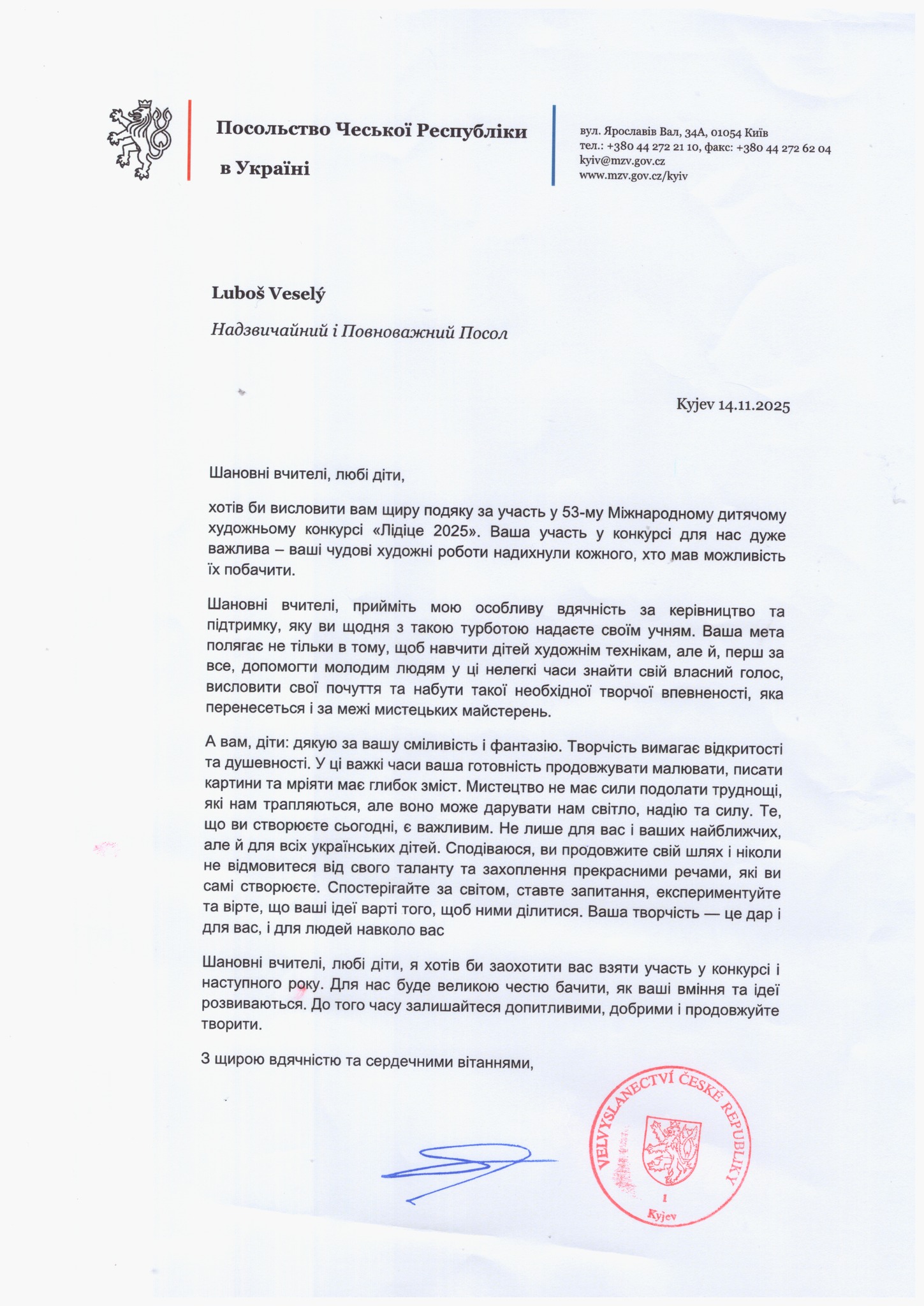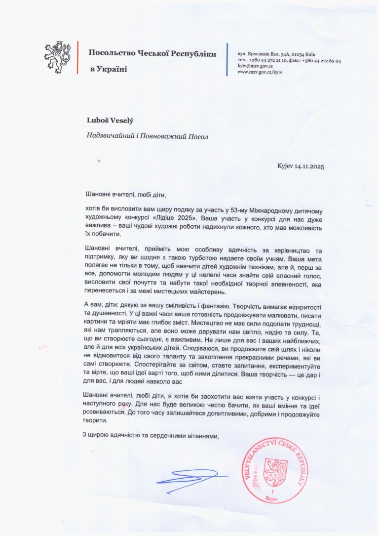 Щира подяка Посольству Чеської Республіки в Україні за підтримку культурних ініціатив та розвиток міжнародної мистецької співпраці.