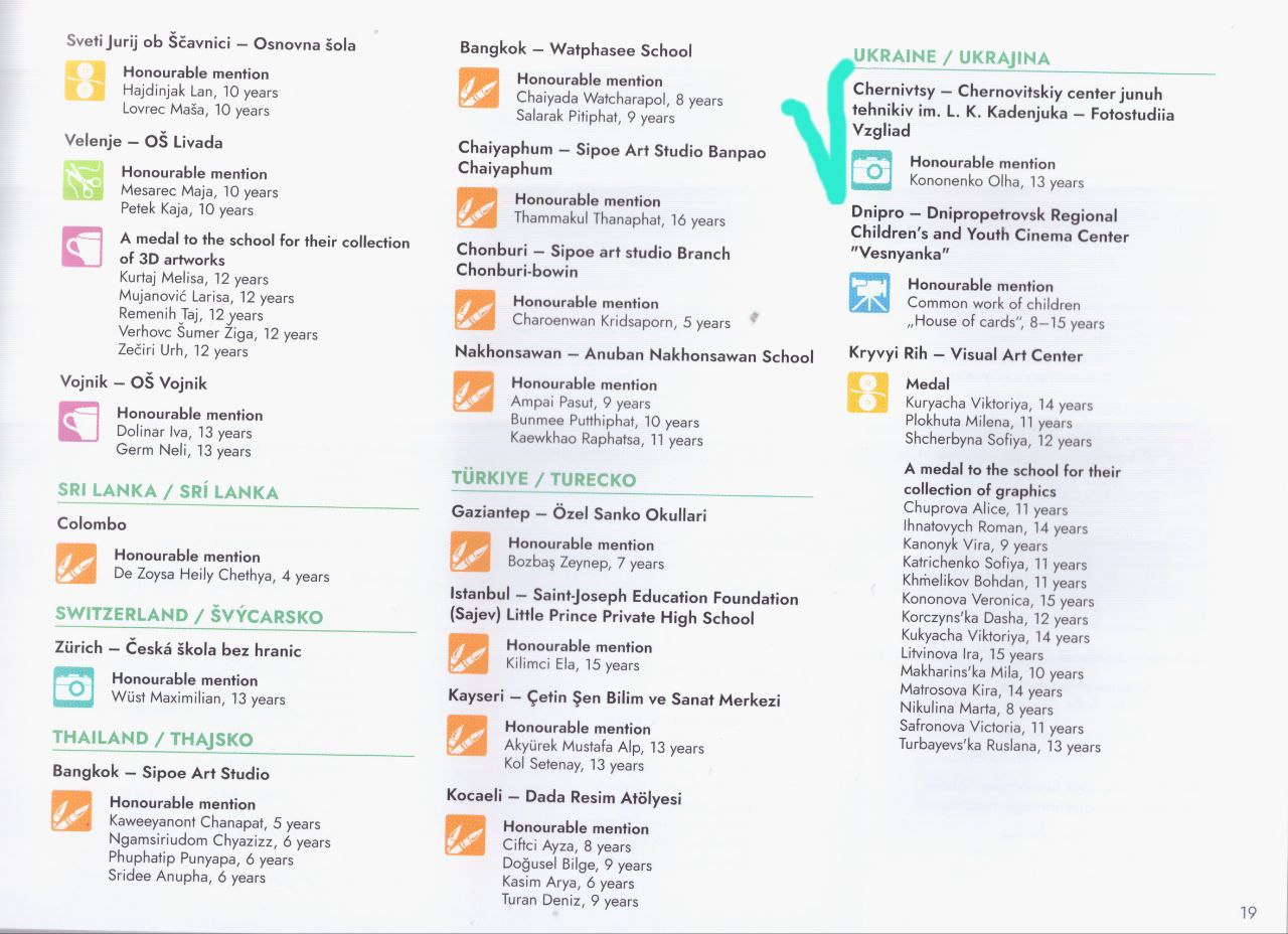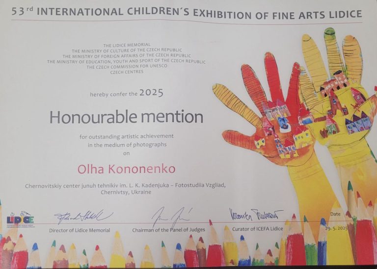Щиро вітаємо вихованку фотостудії «Погляд» КОНОНЕНКО Ольгу (керівник — Микола Олексійович Ємельянов) з вагомим міжнародним успіхом — отриманням почесного диплому за видатні художні досягнення у сфері фотографії у 53-му Міжнародному дитячому художньому конкурсі «Лідіце – 2025» за світлину «Театр тіней»