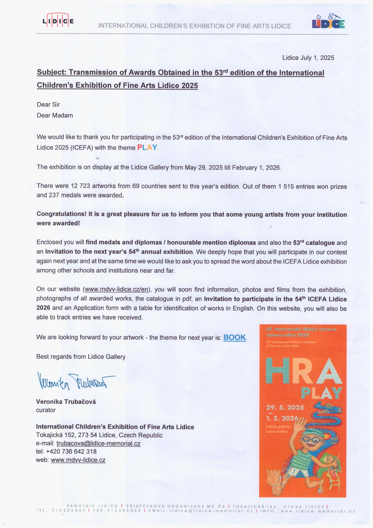 Міжнародний дитячий художній конкурс «Лідіце» (Lidice International Children’s Exhibition of Fine Arts) — один із найпрестижніших дитячих мистецьких конкурсів світу. Щороку у ньому беруть участь тисячі дітей і підлітків із десятків країн, а роботи відбирає міжнародне журі за високими художніми критеріями.