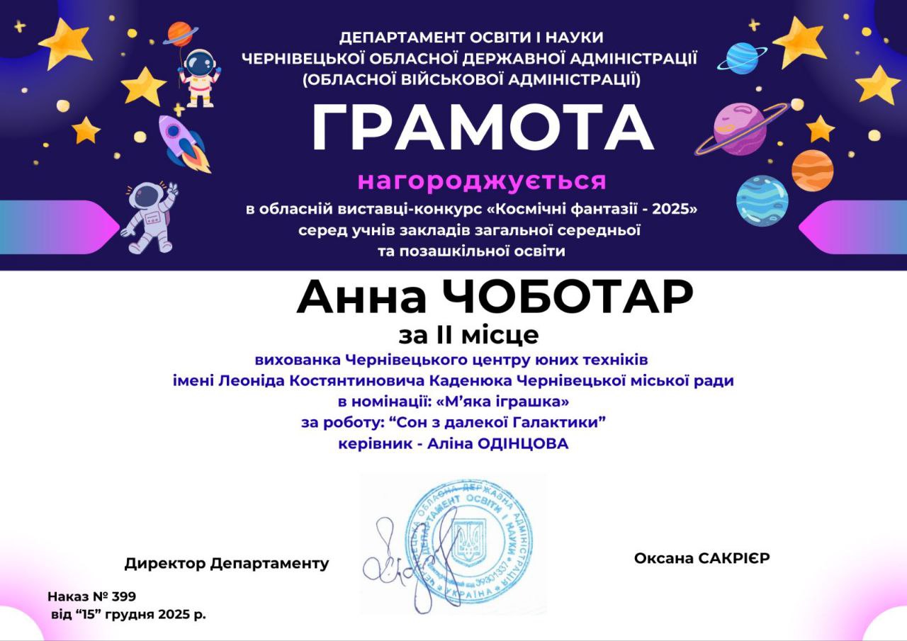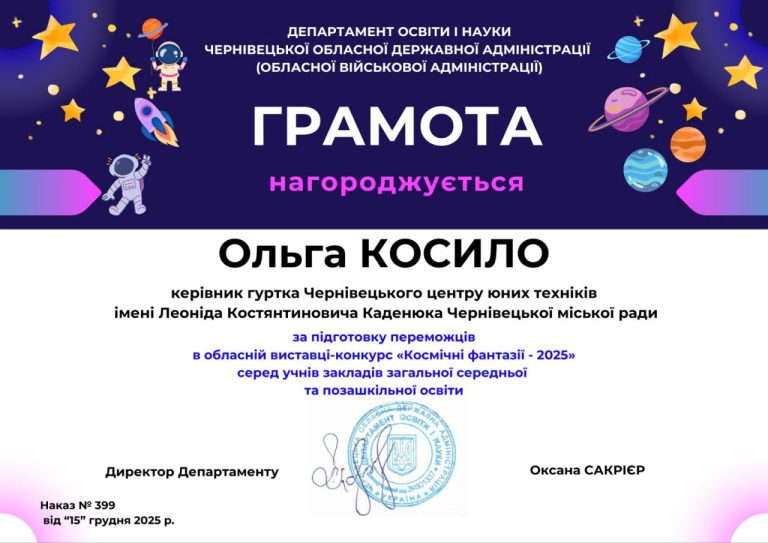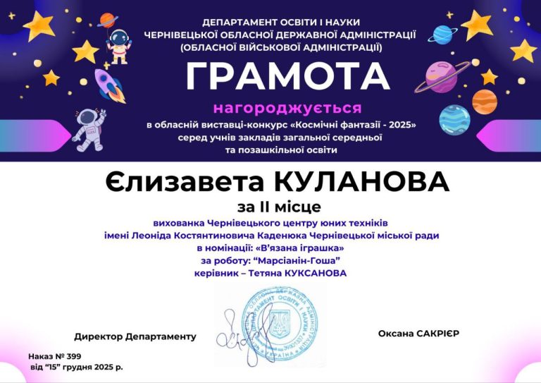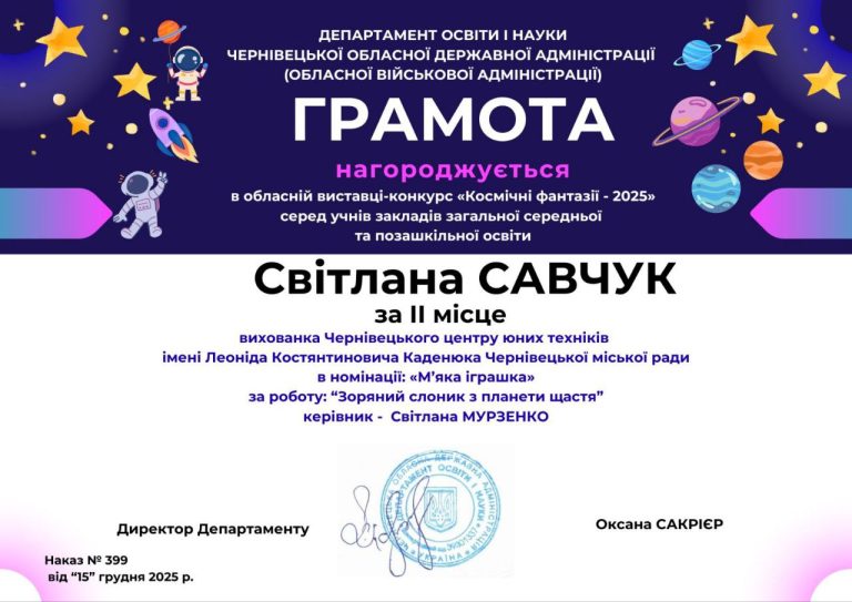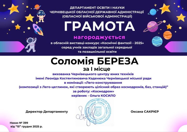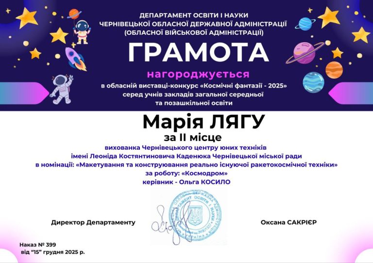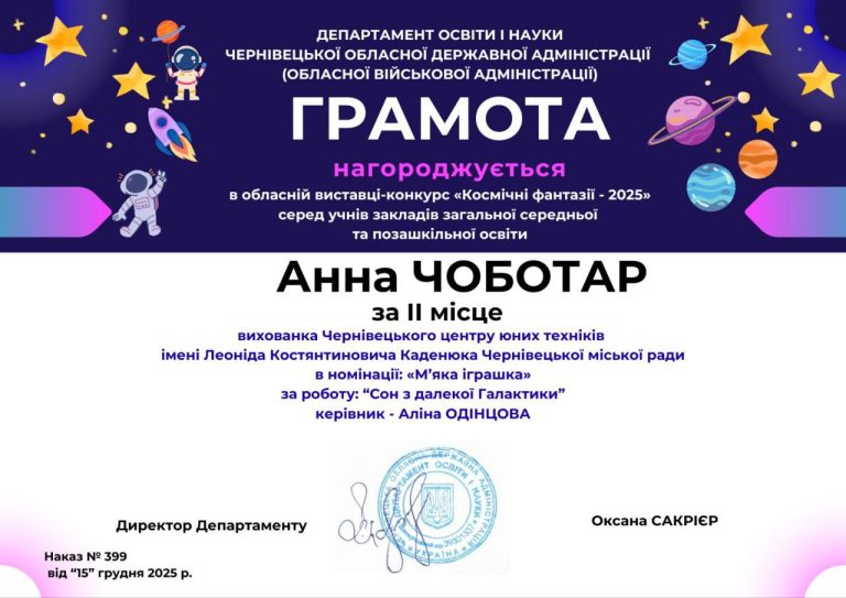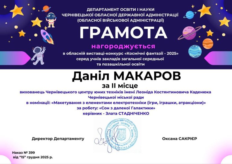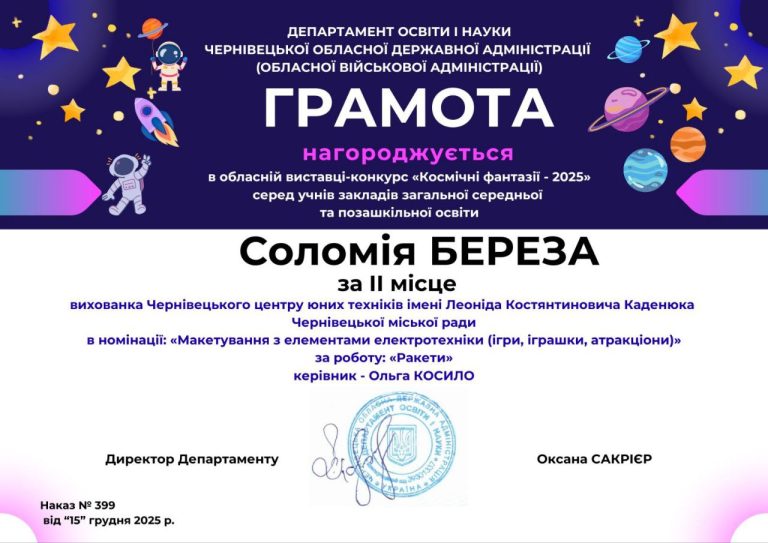 Здобувачі освіти Чернівецького центру юних техніків імені Леоніда Костянтиновича Каденюка Чернівецької міської ради отримали грамоти переможців обласної виставки-конкурсу «Космічні фантазії».