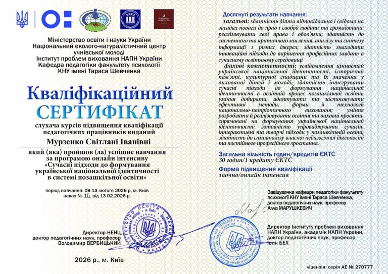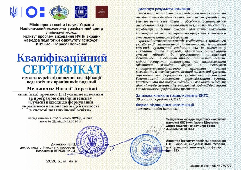 Педагоги Чернівецького центру юних техніків ім. Л. К. Каденюка — Світлана Мурзенко, заступник директора з навчально – виховної роботи, та Наталія Мельничук, методист закладу — успішно пройшли навчання за програмою онлайн-інтенсиву «Сучасні підходи до формування української національної ідентичності в системі позашкільної освіти».